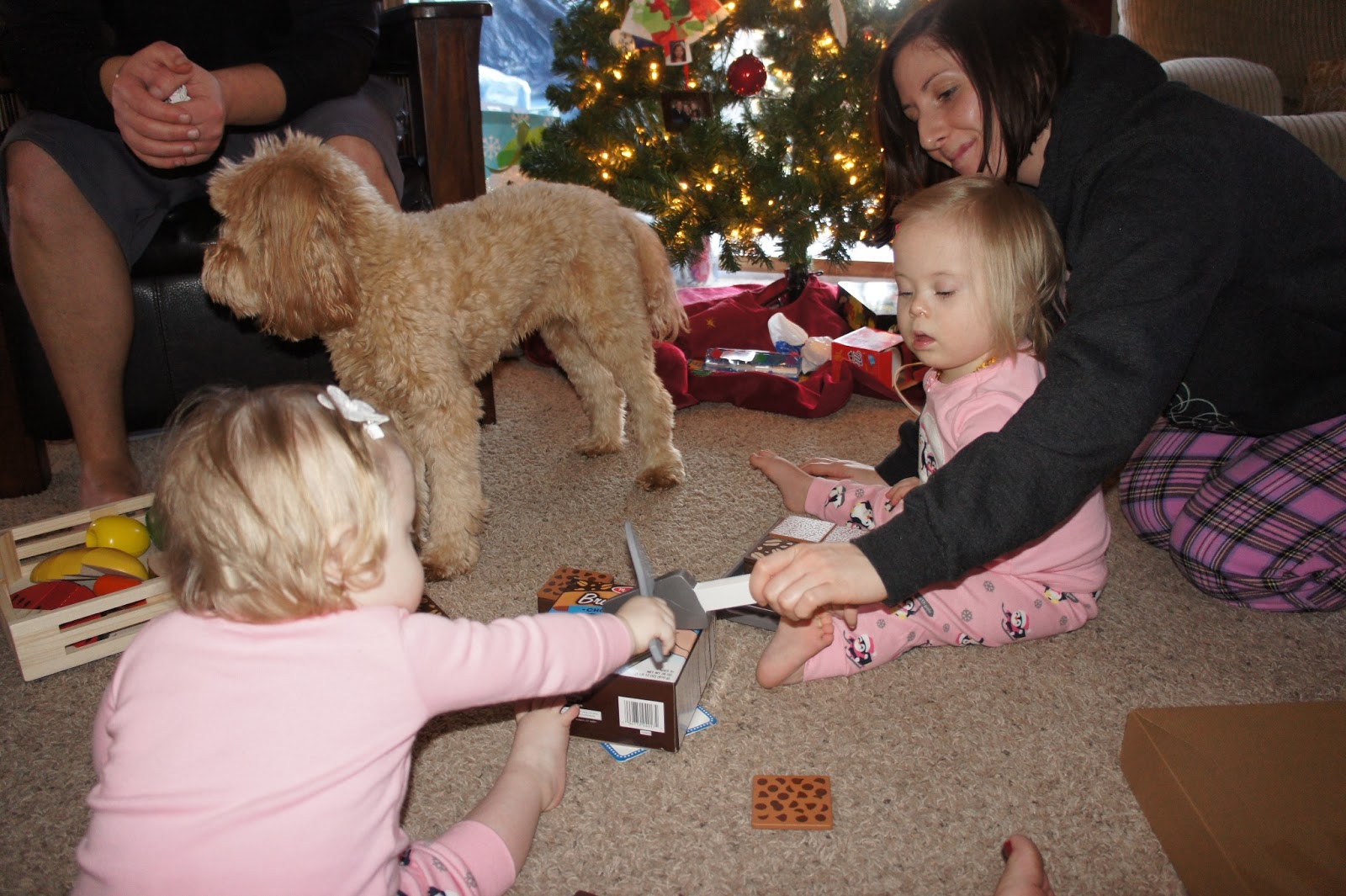 | Each of the girls got to open one present from us....they were all kitchen toys for all 3 to share :) Our girls are not huge on opening a million presents, thankfully :) And with our biggest gift this year being our Sofia girl, it was a light Christmas with the presents (from Mama and Daddy anyways LOL). Our girls SERIOUSLY have everything they need and just about everything they could ever imagine they'd want...they're spoiled rotten by friends and family, that's for sure! |